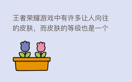 皮肤等级是王者荣耀游戏中对皮肤品质的一个划分。它通常分为四个等级 普通、稀有、史诗和传说。普通皮肤是指游戏中最常见的皮肤,其获取难度比较低,但品质和效果也相对较差。稀有皮肤则是比普通皮肤更为罕见、品质更高、效果更炫酷的皮肤。史诗皮肤则是稀有皮肤的升级版,往往配有激活特效,可谓高配版。传说皮肤则是最顶级的皮肤,是比史诗皮肤更稀有、更难获取、品质和效果更高的皮肤。